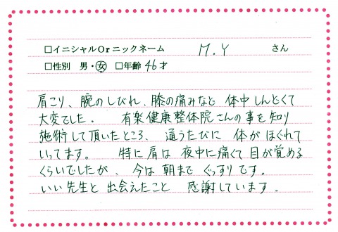 特に肩は夜中に痛くて目がさめるくらいでしたが、今は朝までぐっすりです。いい先生と出会えたこと感謝しています。